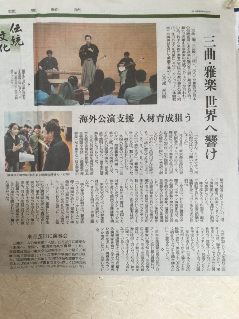 全編英語WS終わりました。翻訳ソフト?で降りてきた大まかな台本から、自分でも意味のわからない単語や言い回しを変えてなんとなく頭で整えて臨みました。作り込んできた方や丸暗記しようとした方、メンバーの様々なアプローチを尻目に、僕は当日のひらめきでずいぶん変更しました。感じた事は、邦楽や邦楽器は、国籍問わず知らない方からすると奇妙な面白いコンテンツが満載だということ、我々が考えなければならないことはその見せ方だ、ということです。そしてそれにはまずなによりも、我々自身がそう感じている事が大事で、感じられないのであれば考えて探さなければならないということ。自分が面白いと思ってないことを人に魅力的に伝えられるわけがない。人の数だけあたりまえがある。そう考えると「共感する」ってすごいことだと思う。この日は本編終了後交流タイムがありましたが、一番もどかしかったのはここ。相手が言っていること、疑問に感じた内容はわかるのに、説明することができない。単語が出てこない。義務教育をサボりまくった自分を呪ったか?いやいやいや。普段の生活から、たまにでいいから例えばこのおにぎりを美味しいと思う理由を英語で言ったらどうなるか、とかそういう、英語を身近にしておく訓練こそが生きた英語で、そのためにわからない単語を憶えることが大事だと思いました。しかし、英語で解説した後「初音曲」演奏はめちゃくちゃ大変でした。もう、ほんと。新聞読まれた方から異口同音に言われたのが、僕だけ年齢いってるということ。わかってます。僕は育成してもらう方ではないですよね。僕にしか出来ないことを、引き続き考えて、お国のお金を無駄にしないようにしたいと思います。
