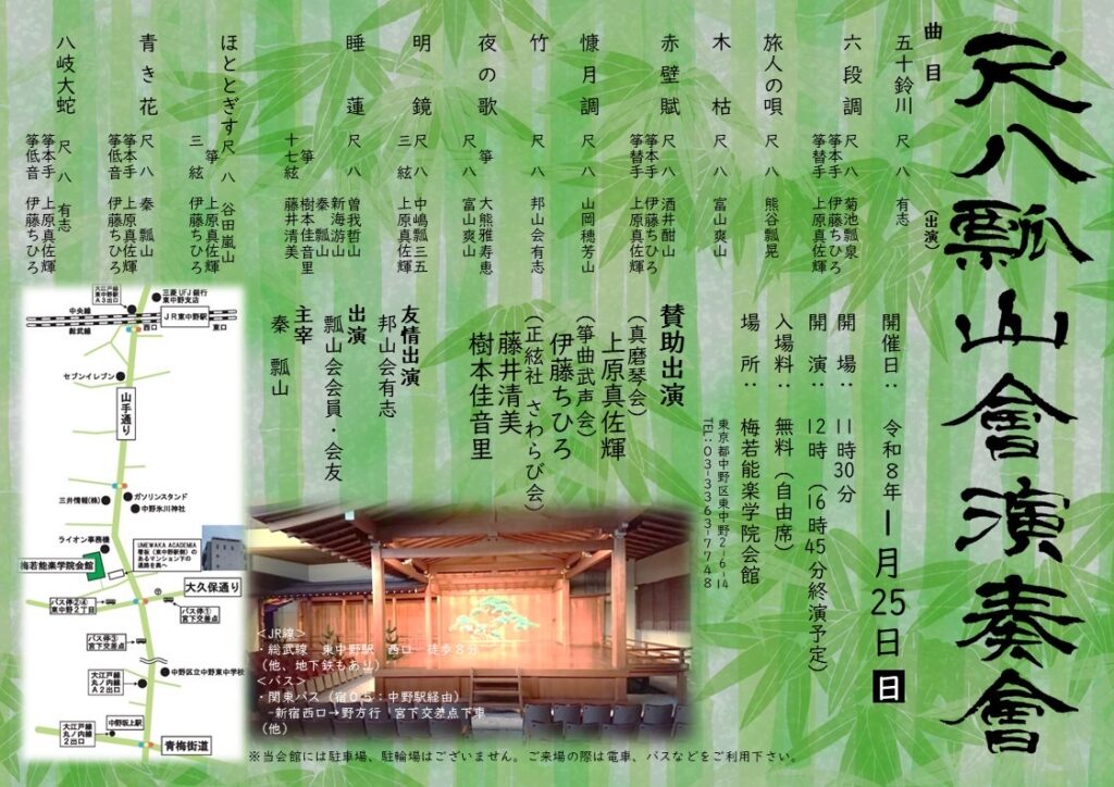 昨年12/6お世話になりました秦瓢山さんの演奏会です。伊藤ちひろさんと演奏いたします。山田流とあまり馴染みがないとのことで、割と人気曲が並びました。ただその中でやはり嬉しいのは二代上原真佐喜曲が二つもあること。どんどん広めていきたいです。ちひろさんにはいつもながら、他所の曲で慣れない上に低音をお願いすることになり、申し訳ない気持ちです。慣れてくれたら嬉しいですが。昨年の都山流楽会の講習会で八岐大蛇を提案してくださった稲津英威山さん、そこからご縁を繋いでくださった秦瓢山さんに感謝です。梅若能楽堂は1961年完成の歴史ある能楽堂です。この舞台に立つのは初めてで、とても嬉しいです。是非ご来場ください。