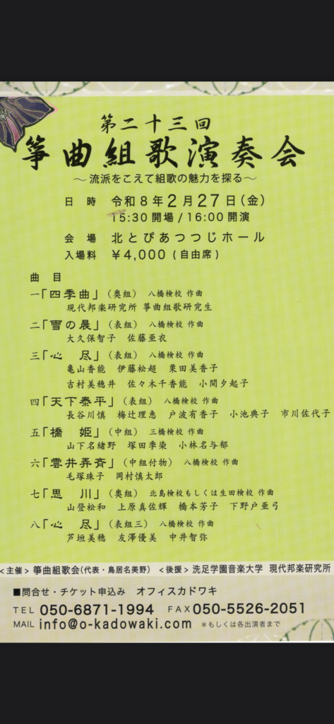 第二十三回箏曲組歌演奏会2026.2.27(金) 2026年2月14日 最終更新日時 : 2026年2月14日 Site administrator 今年もやってまいりました組歌演奏会。いつもながら初めての曲「思川」です。恨み、悲しみをひたすら歌う曲ですが、むしろ淡々と。内に込めていきたいと思ってます。山登松和兄貴含め、今回もまた頼りになる先輩達に囲まれ、幸せ者なので、足引っ張らないようにやりたいです。紀尾井ホール改修のため、今回は王子北とぴあ開催となります。ご注意くださいませ。 Follow me! FacebookXHatenaPocketCopy