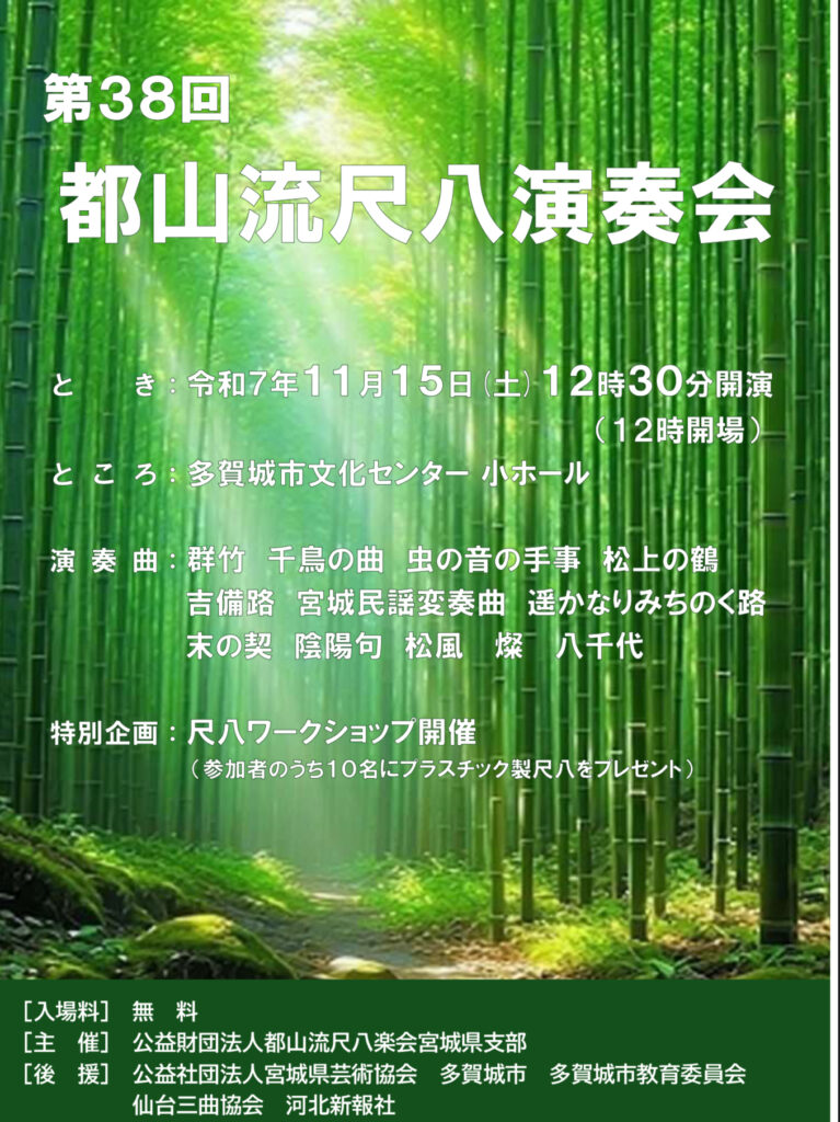 第38回都山流尺八演奏会 2025年11月14日 最終更新日時 : 2025年11月14日 Site administrator 明日のことで恐縮ですが、宮城県は多賀城市というところでの演奏会に真磨琴会仙台支部とともに「松風」「松上の鶴」を演奏いたします。多賀城は昨年創建1300年を迎えた歴史あるところです。めでたい曲と、「松風」に登場する姫が宇和島藩伊達家の姫の可能性がある、というところでの松風です。今年最後の仙台演奏、とにかくみんなでやってみましょう! Follow me! FacebookXHatenaPocketCopy